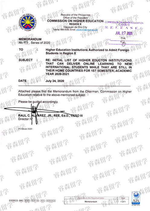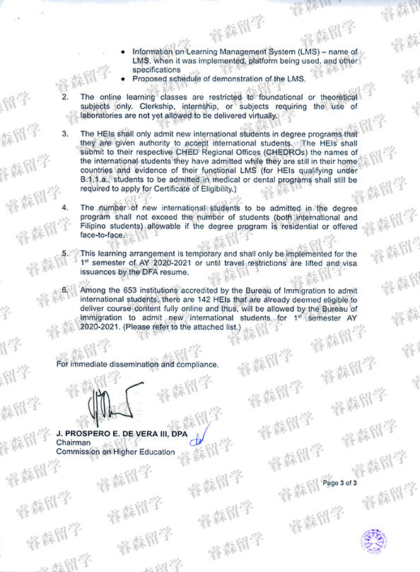 菲律宾高教委疫情期允许开设网课招收外国留学生资质文件